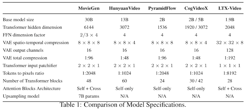 この表は、複数のビデオ生成モデルの仕様を比較しています。表ではMovieGen、HunyuanVideo、PyramidFlow、CogVideoX、LTX-Videoという5つのモデルを取り上げています。各モデルのベースモデルサイズ、変換器の隠れ次元、FFNの次元要因、VAEの圧縮率、変換器の入力パッチファイア、トークン対ピクセル比、変換器ブロックの数、注意ブロックのアーキテクチャなどが示されています。LTX-Videoは高圧縮率と高効率性に特化したモデルです。