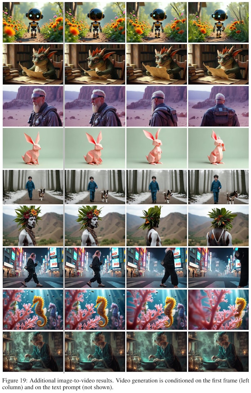 この画像は、LTX-Videoというモデルが生成した「画像から動画」変換の結果を示しています。動画生成は、左の最初のフレームに基づいて行われ、未表示のテキストプロンプトも条件として使用されています。このモデルは、初期フレームを条件にすることで、入力画像を動画へと自然に拡張できることを示しています。結果は、モデルの高い視覚品質と忠実な動き表現を強調しています。