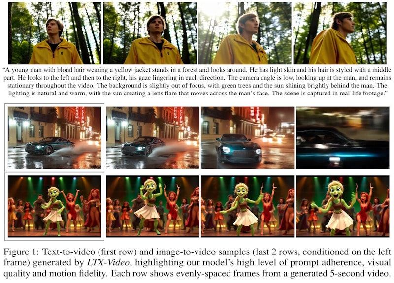この画像は、LTX-Videoというモデルによって生成された映像サンプルを示しています。上段はテキストからビデオへの生成例、下段は画像を条件としたビデオ生成例です。これらのサンプルから、LTX-Videoモデルの高いプロンプトの追従性、視覚品質、動きの忠実度が確認できます。各行は、生成された5秒間のビデオから均等に間隔をあけたフレームを示しています。