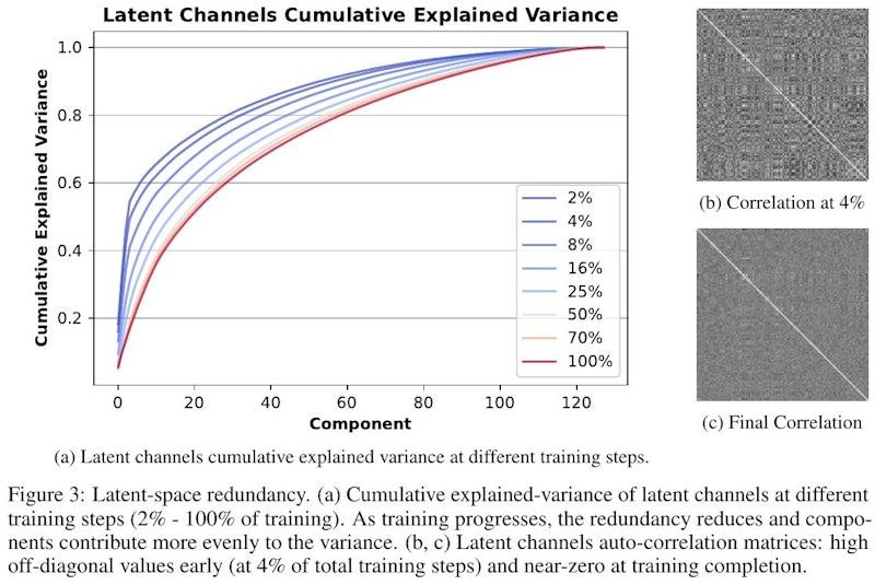 この図は、LTX-Videoモデルの学習過程における潜在空間の冗長性を示しています。(a)のグラフは、学習の異なるステップでの潜在変数が累積的に説明する分散を示しています。ステップが進むにつれて、冗長性が減少し、各成分が均等に分散に寄与するようになります。(b)と(c)の相関行列は、学習初期(4%)ではオフダイアゴナルの値が高く、学習が完了するとほぼゼロになることを示しています。