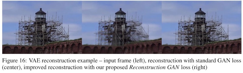 この画像は、VAE(変分オートエンコーダ)の再構築例を示しています。左側が入力フレームで、中央は標準的なGAN損失を使用した再構築です。右側が「Reconstruction GAN損失」を用いた改良された再構築です。この新しい損失関数によって、再構築の質が大幅に向上し、詳細がより鮮明に保存されていることが示されています。特に速い動きや細かいディテールがある状況で効果的です。