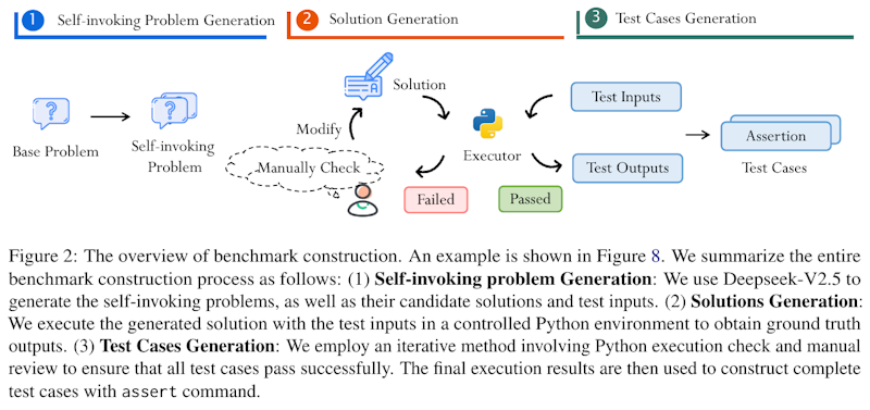 この図はベンチマークの構築プロセスを示す概要です。プロセスは3つのステップで構成されます。まず、「自己呼び出し問題生成」はDeepseek-V2.5を用いて問題と解答、テスト入力を生成します。次に、「解答生成」は生成された解答をコントロールされたPython環境で実行し、正確な出力を取得します。最後に「テストケース生成」はテストケースがすべて合格するか繰り返しチェックし、マニュアルでレビューします。この一連のプロセスを経て、完成されたテストケースが構築されます。