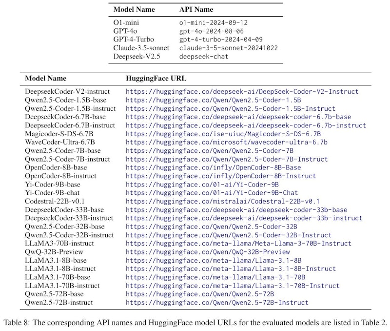 この画像は、研究論文で評価されたモデルのAPI名とHuggingFaceモデルのURLを示しています。表には、さまざまなモデルの名前とそれに対応するAPI名やHuggingFace URLが詳述されています。これにより、モデルの具体的な評価やアクセス方法が容易になり、研究や実験での再現性が確保されています。このような情報は、コード生成のような複雑なタスクにおけるモデル性能を理解するための基盤として役立ちます。