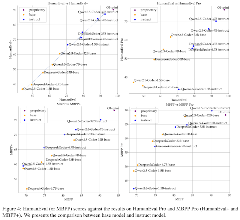 図4は、プログラミング能力を評価するためにベースモデルとインストラクションモデルを比較したものです。具体的には、HumanEvalとMBPPのスコアに対するHumanEval ProとMBPP Proの結果を示しています。図からわかるように、インストラクションモデル(青いドット)は通常のコード生成タスクでは大幅に改善されますが、より複雑な自己呼び出し型のタスクではその効果が限られています。したがって、自己呼び出しタスクでの性能向上にはさらなる工夫が必要です。