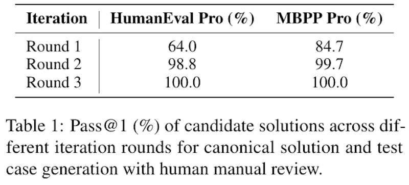 論文から抽出された表1は、Self-Invokingコード生成におけるLLMの性能を評価しています。表は、各イテレーションラウンドでのHumanEval ProとMBPP ProのPass@1(%)を示しています。初回ラウンドから第3ラウンドまで、モデルの性能が向上しており、最終的には100%の成功率に達しています。これは、人間の手によるレビューとコードテストの反復改善が、モデルの応答の精度向上に効果的であることを示しています。