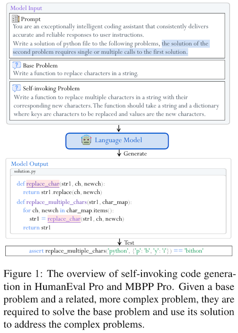 この図は、LLMが自己呼び出し型のコード生成を行う方法を示しています。まず、基本問題として文字列内の文字を置き換える関数を作成し、その解決策を使ってより複雑な自己呼び出し型問題(複数の文字を置き換える)的に取り組むことが求められます。これにより、モデルは自身の生成したコードを活用し、複雑なタスクを解決する能力が評価されます。