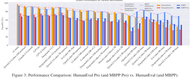 この図は、「HumanEval Pro」および「MBPP Pro」と、従来の「HumanEval」および「MBPP」におけるモデル性能の比較を示しています。縦軸はパス率(pass@1)で、より高いほどモデルの性能が高いことを示します。黄色とオレンジのバーは従来のテストでの結果、青のバーは拡張版での結果です。全体的に、モデルは新しい自己呼び出しタスクでの性能が落ちることが多いことを示しています。これは、複雑な自己呼び出しコード生成がモデルに新たな課題を提示しているからです。