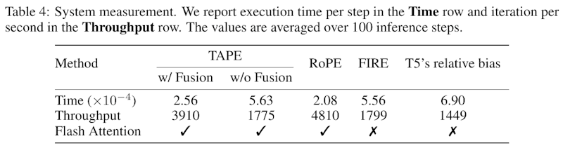 このテーブルは、言語モデルの異なる方法の処理速度とスループットを比較しています。TAPE(Fusionあり)は、処理時間が短く、スループットが高いことが特徴です。RoPEも高速で、スループットが高いです。一方、FIREとT5の相対バイアスは、Flash Attentionに対応していないため、処理速度とスループットが劣ります。Fusion技術を使うことでTAPEはさらに効率が向上しています。