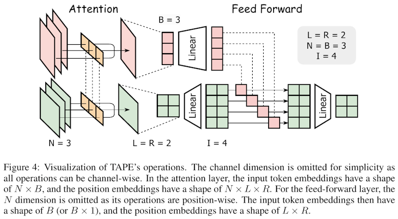 図4は、TAPE(文脈に応じた等変位置埋め込み)の操作を示しています。この図は、トークンと位置の埋め込み方法を、アテンション層とフィードフォワード層でどのように処理するかを示しています。基本的に、N × Bの形のトークン埋め込みと、N × L × Rの形の位置埋め込みを使い、処理を進めます。位置の特性を生かしつつ、トークンの情報を強化することで、モデルの性能を向上させるアプローチです。