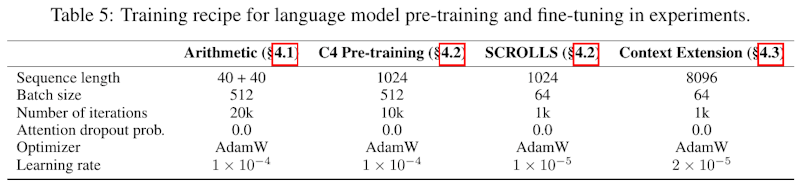 この画像は、研究で使用された言語モデルの事前学習と微調整の方法を示す表です。表には、異なる実験(Arithmetic、C4 Pre-training、SCROLLS、Context Extension)のためのパラメータが記載されています。各実験のシーケンス長、バッチサイズ、反復回数、注意ドロップアウト確率、オプティマイザー、学習率が示され、これらの設定が学習の成功に重要であることがわかります。この情報は、実験の再現性や他のタスクへの適用可能性を評価するのに役立ちます。