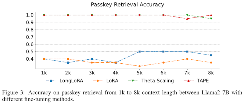 この図は、Llama2 7Bを使用して、異なるファインチューニング手法で1kから8kのコンテキスト長におけるパスキー取得の精度を示しています。TAPEは、全体を通じて非常に高い精度を維持しており、他の手法より優れています。Theta Scalingは安定した性能を示していますが、LoRAとLongLoRAは精度に波があります。TAPEは長いコンテキストタスクで優秀な性能を示しています。