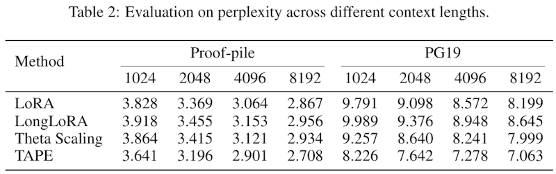 この表は、異なる文脈長における言語モデルの「ペープレキシティ」を評価した結果を示しています。ペープレキシティは、モデルの予測の不確実性を表します。数値が低いほど、モデルの予測は正確であることを示します。 「Proof-pile」と「PG19」の2つのデータセットが使用されています。各手法は、「LoRA」、「LongLoRA」、「Theta Scaling」、および新提案の「TAPE」です。結果から、TAPEは他の手法と比べて一貫して低いペープレキシティを達成しており、特に長い文脈で優れています。これは、新しい文脈化された位置埋め込み法であるTAPEが、テキストの長文脈処理において効果的であることを意味します。