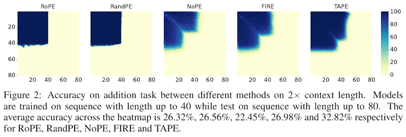図2は、異なる手法での加算タスクの精度を示したヒートマップです。この実験では、長さ40のシーケンスで学習したモデルを、長さ80のシーケンスでテストしています。表示された結果の平均精度は、RoPEが26.32%、RandPEが26.56%、NoPEが22.45%、FIREが26.98%、TAPEが32.82%です。TAPEが他の手法よりも高い精度を示し、特に長いシーケンスへの適応性が示されています。