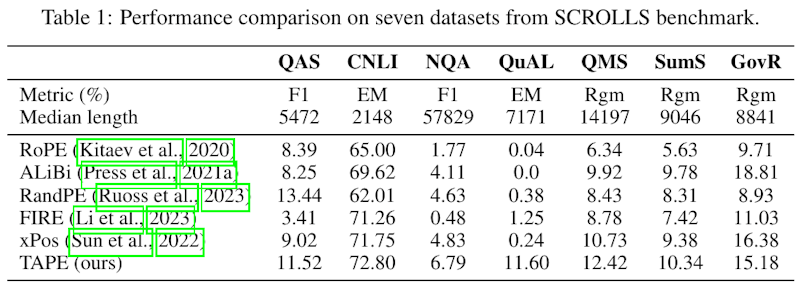 実験では、TAPEを既存の最新モデル(例:RoPEやFlash Attention)と比較し、長文依存タスクにおける優れた能力を実証しました。具体的には、SCROLLSベンチマークにおいて複数の指標で従来モデルを上回る結果を示しています。また、1024トークンを超える長文入力タスクや数学的推論課題でも高い汎用性を発揮しました。