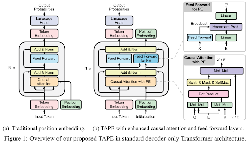 この図は、トランスフォーマーモデルにおける位置エンコーディングの新しいアプローチを示しています。左の図(a)は、従来の位置エンコーディングの構造です。右の図(b)は、提案されたTAPE(Equivariant Position Embedding)を用いたモデルで、因果的注意とフィードフォワードレイヤーを強化しています。さらに、位置情報が層をまたいで拡張され、トークンの文脈情報を取り入れることで、モデルの安定性と適応性を向上させます。この設計により、複雑なタスクに対してより優れた処理能力を発揮します。