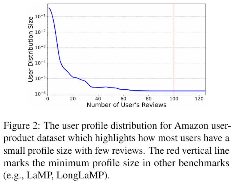 図2は、Amazonのユーザープロダクトデータセットにおけるユーザープロフィールの分布を示しており、多くのユーザが少ないレビュー数で非常に小さなプロフィールサイズを持っていることを強調しています。ユーザのレビュー数に対する分布が対数スケールで表示されており、曲線はレビューが少ないユーザが圧倒的に多いことを示しています。赤い垂直線は、他のベンチマーク(例えば、LaMP、LongLaMP)での最小プロフィールサイズを示しています。この情報は、ユーザプロファイルが小さくても、個人化されたコンテンツ生成や情報検索におけるモデル評価において、データの制約を示す重要な指標となります。