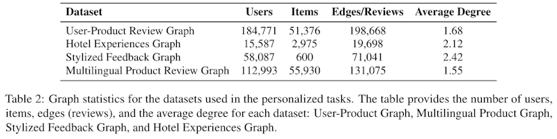この表は、さまざまなグラフベースのデータセットにおけるデータ統計を示しています。具体的には、ユーザー数、アイテム数、エッジ(レビュー)数、そして各グラフにおける平均次数が記載されています。主な対象となるデータセットには、「User-Product Review Graph」、「Hotel Experiences Graph」、「Stylized Feedback Graph」、「Multilingual Product Review Graph」があります。 「User-Product Review Graph」には最も多くのユーザー(約18万4771人)がおり、エッジ数は19万8668です。一方、「Hotel Experiences Graph」はユーザー数が1万5587人でエッジは1万9698と少なめです。平均次数は「Stylized Feedback Graph」が2.42と最も高く、他のグラフよりもユーザーとアイテムの関係性が密接であることを示しています。この統計は、パーソナライズされたタスクでのデータセットの特性を理解するのに役立ちます。