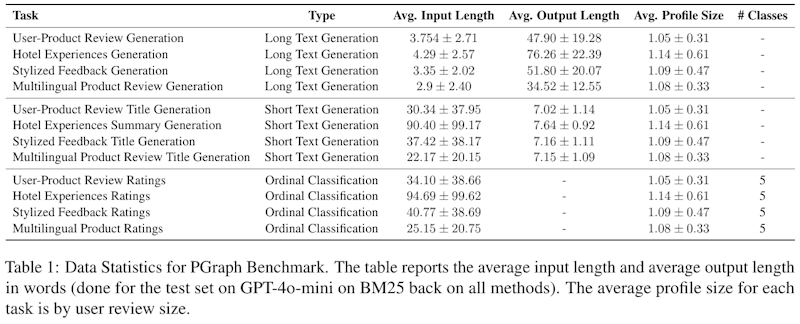 この画像は、データベンチマーク「PGraph」の統計情報を示しています。表には、さまざまなタスクの入力と出力の平均長さ、プロフィールサイズ、そして分類タスクのクラス数が記載されています。具体的には、「長文生成」や「短文生成」、「序数分類」に関するタスクが並べられています。それぞれのタスクで入力と出力の長さが異なり、たとえば「ホテル体験生成」の平均出力長さは他と比較して長いです。これらの統計は、ユーザーレビューのサイズに基づいており、研究の基盤として使用されるサンプルデータを特徴付けています。たとえば、序数分類タスクでは、5つのクラスに渡って評価が行われています。