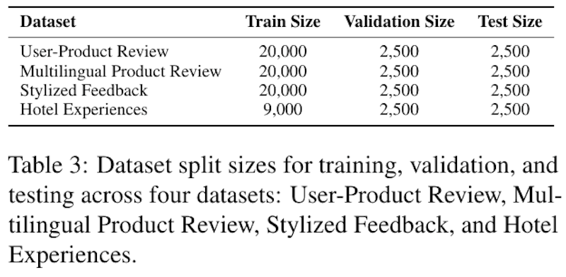 この画像は、論文「Personalized Graph-Based Retrieval for Large Language Models」からのもので、4つのデータセットにおける訓練、検証、およびテストのデータ分割サイズを示しています。各データセット名と対応するデータサイズが表にまとめられています。「User-Product Review」や「Multilingual Product Review」では20,000の訓練例を持ち、検証とテストにはそれぞれ2,500の例があります。「Hotel Experiences」は訓練例が9,000で、検証とテストはやはり2,500ずつあります。これらのデータセットは、個別化されたテキスト生成モデルの開発と評価に使用されており、特にユーザ履歴が乏しい場合でも、モデルの性能を検証できるようになっています。
