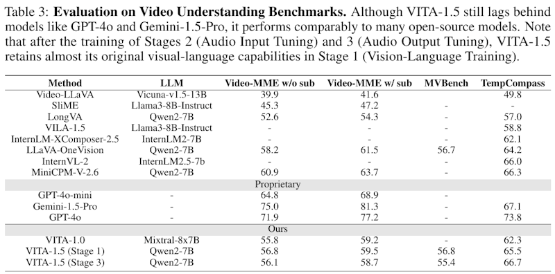 この表は、ビデオ理解ベンチマークにおけるモデルの性能を評価しています。主な焦点は、VITA-1.5がオープンソースモデルと比較してどの程度の性能を持つかです。表では「Video-MME」「MVBench」「TempCompass」などの指標で評価されており、VITA-1.5は「Video-MME」で55.8点から59.5点を獲得していることが示されています。これは、オープンソースモデルとほぼ同程度の性能ですが、プロプライエタリモデル(GPT-4oやGemini 1.5 Pro)にはまだ及ばないことが分かります。また、ステージ2とステージ3のトレーニング後でも、ビジュアル・ランゲージの能力をほぼ維持していることが強調されています。