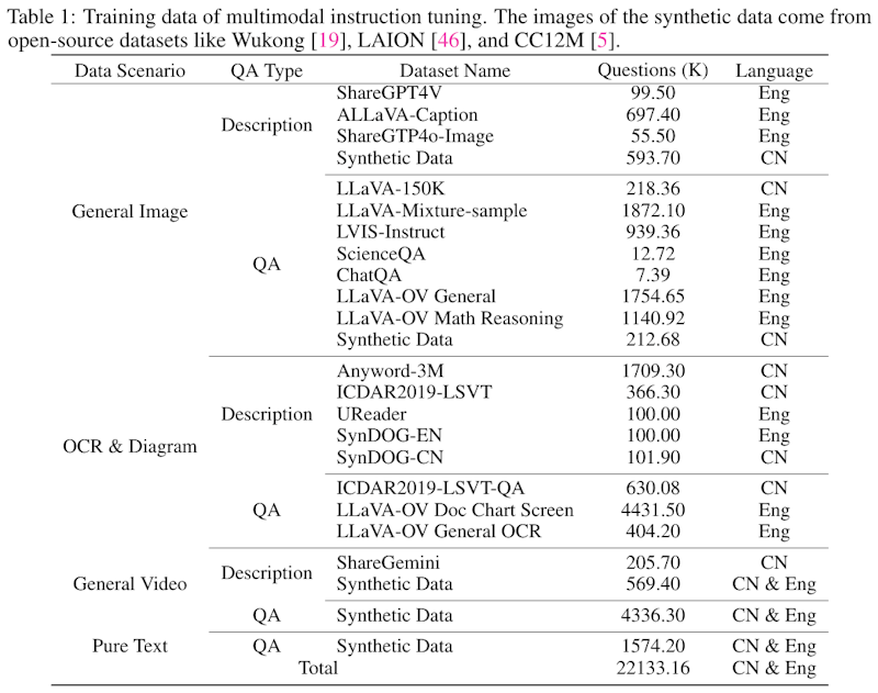 この画像は、論文で使用されたマルチモーダル指示調整のためのトレーニングデータを示しています。データは「一般画像」「OCRと図」「一般動画」「純粋テキスト」などのシナリオに分けられ、それぞれに「説明」と「QA(質問応答)」のタイプがあります。各データセットの名前、質問数(K、千単位)、言語が示されており、英語と中国語のデータセットが含まれています。合計で約22,133.16Kの質問が用意され、画像データの一部はWukongやLAIONなどのオープンソースから取得されています。この表は、VITA-1.5のマルチモーダルな学習プロセスにおけるデータの多様性とボリュームを示しています。