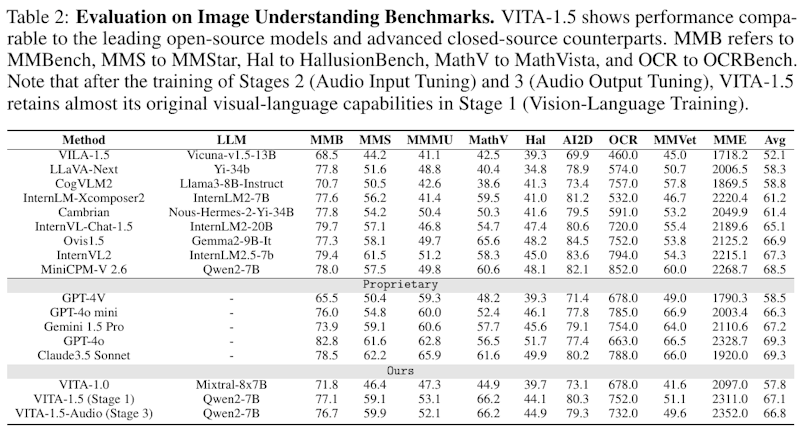 この表は、画像認識ベンチマークでのVITA-1.5の性能を示しています。VITA-1.5は、最新のオープンソースモデルや高度なクローズドソースモデルと比較して、優れたパフォーマンスを発揮しています。各列は異なる評価基準を表しており、「MMB」から「MMVet」までのそれぞれの指標でのモデルのスコアが載っています。表内では、VITA-1.5がビジュアルと言語の訓練段階後も、視覚と言語の能力をほぼ維持していることが示されています。全体的な平均スコアの欄では、VITA-1.5の平均点が示され、多くのモデルと互角か、それ以上の成果を上げていることがわかります。