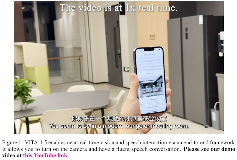 この画像は、VITA-1.5がリアルタイムで視覚と音声のインタラクションを可能にする様子を示しています。画像の中では、スマートフォンが映っており、「VITA-1.5 デモ」と記された画面が表示されています。このデモは、カメラをオンにしてスムーズな音声対話を実現する様子を説明しています。VITA-1.5は、視覚と言語の統合を強化し、端から端までのフレームワークを通じてリアルタイムに近いインタラクションを提供します。このシステムは、ユーザーの利便性を向上させるために、音声認識とテキスト生成を効率的に行うことができ、画像や音声のタスクにおいて優れた性能を発揮します。