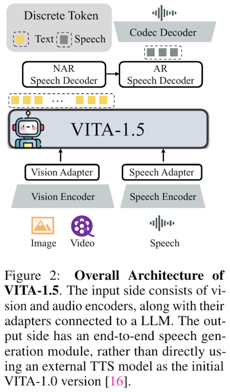 画像は、VITA-1.5の全体的なアーキテクチャを示しています。このモデルは、視覚情報と音声情報を扱えるように設計されています。入力側には、視覚と音声のエンコーダーがあり、それぞれにアダプターが付いていて、これらが大規模言語モデル(LLM)と連携しています。出力側では、VITA-1.5には独自の音声生成モジュールがあり、以前のバージョンVITA-1.0のように外部の音声合成(TTS)モデルを使用することなく、音声を生成できます。この設計により、リアルタイムでの視覚と言語の統合的な理解と、スムーズな音声対話が可能になります。