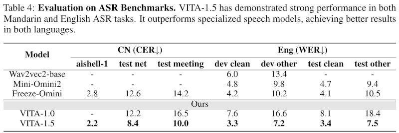 この図は、ASR(自動音声認識)のベンチマークテストにおけるモデルの性能を示しています。表には「CN(CER)」と「Eng(WER)」の2つの言語での結果が表示されています。CERは文字誤り率、WERは単語誤り率を表します。 「VITA-1.5」は、Mandarin(中国語)と英語の両方で高い性能を示しており、特化型スピーチモデルを上回る結果を達成しています。特に、VITA-1.5は他のモデルと比較して低い誤り率を記録しています。例えば、Mandarinのaishell-1でのCERは2.2であり、英語のdev cleanでのWERは3.3と、かなりの低値を示しています。この結果は、VITA-1.5の音声認識能力の高さを証明しています。